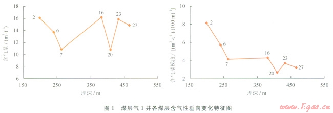 處于織納煤田比德三塘礦區(qū)的煤層氣l井,其各可采煤層(2、6、7、16、20、23、27號煤層)實(shí)測含氣量與含氣梯度隨層位降低均呈波動(dòng)式變化(表1,圖l)。