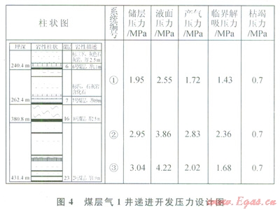 由于各含氣系統(tǒng)壓力不同,合層排采會(huì)產(chǎn)生層間干擾。煤層氣l井鉆井、固井結(jié)束后,由靜止液而高度計(jì)算得出①、②、③號含氣系統(tǒng)的液而壓力分別為2.55、3.86、4.22MPa(圖4),分別比各系統(tǒng)的儲層壓力高0.6、0.91、1.18MPa,若井孔處理不干凈的話,對煤儲層有一定程度的污染?;趯?shí)測含氣量、蘭格繆爾參數(shù)計(jì)算①、②、③號含氣系統(tǒng)的臨界解吸壓力分別為1.43、2.36、1.68MPa,產(chǎn)氣壓力分別為l.72、2.83、2.02MPa(基于山西沁水盆地南部煤層氣井排采實(shí)踐,產(chǎn)氣壓力約為臨界解吸壓力的1.2倍[16-19]。依據(jù)煤層氣l井各系統(tǒng)內(nèi)煤儲層壓力、臨界解吸壓力和產(chǎn)氣壓力,對3個(gè)含氣系統(tǒng)設(shè)計(jì)了遞進(jìn)開發(fā)次序。