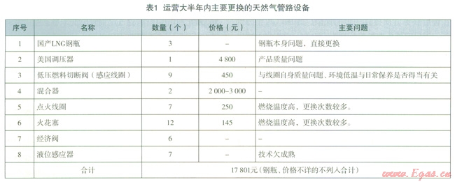 據(jù)大概統(tǒng)計(jì),l00余臺(tái)LNG公交,投用大半年來,天然氣燃料系統(tǒng)更換的設(shè)備材料費(fèi)用總共約2萬元(不包括LNG鋼瓶,鋼瓶本身問題),該部分費(fèi)用均由天然氣燃料系統(tǒng)設(shè)備供應(yīng)商承擔(dān)(售后服務(wù)約定2年)。這些LNG車輛燃料系統(tǒng)出現(xiàn)問題較多的設(shè)備為低壓燃料切斷閥的感應(yīng)線圈、液位感應(yīng)器、點(diǎn)火線圈、火花塞等等。