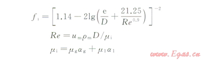 式中fi為氣液界面摩擦系數(shù),無(wú)因次;D為管道當(dāng)量直徑,m;Re為雷諾數(shù);mi為混合物黏度,Pa·s;mg為氣相黏度,Pa·s;ag為空泡率;m1為液相黏度,Pa·s;a1為持液率;CD為阻力系數(shù),無(wú)量綱,是Re的函數(shù):rm為混合物真實(shí)密度,kg/m3;um為氣液混合速度,m/s;當(dāng)um繼續(xù)增大,該平衡狀態(tài)將被打破,巖屑開始運(yùn)移;ui為巖屑顆粒床平均摩阻系數(shù),無(wú)因次;e為巖屑顆粒堆積空隙程度,無(wú)因次;a/b與巖屑堆積程度相關(guān),無(wú)因次。