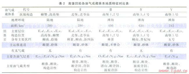 油氣成藏體系指地表以下油氣成藏的自然體系,包括形成油氣藏的一切要素,如烴源體、輸導(dǎo)體和圈閉以及這些元素之間有效的配置結(jié)果[6,11]。成藏體系以油氣聚集單位為中心,這是和含油氣系統(tǒng)以烴源巖為中心的本質(zhì)區(qū)別,因此,利用成藏體系能與勘探日標(biāo)更緊密結(jié)合。油氣成藏體系的劃分主要有以下原則:①劃分油氣成藏體系時烴源巖和主要油氣運聚區(qū)兼顧;②1個具有統(tǒng)一油氣水界面的油氣藏只能屬于1個成藏體系;③對于多套烴源巖、多期成藏的多旋凹盆地,首先根據(jù)構(gòu)造層、高壓封閉層等劃分成藏旋同(生儲蓋含油氣組合),然后再在平面上劃分成臧體系[11]。油氣成藏體系的劃分主要應(yīng)用分割槽法或流體勢法[7,24],將運載層頂面(蓋層底面)的流體勢場分成幾個油氣運移方向和聚集區(qū),每1個運移方向所包含的生油巖及其上方的圈閉組合就構(gòu)成了1個油氣成藏體系。利用該劃分方法,并結(jié)合該區(qū)油(氣)源對比分析的結(jié)果,南俸凹陷町劃分為5個油氣成藏體系(圖1)。各油氣成藏體系的地質(zhì)特征見表2。