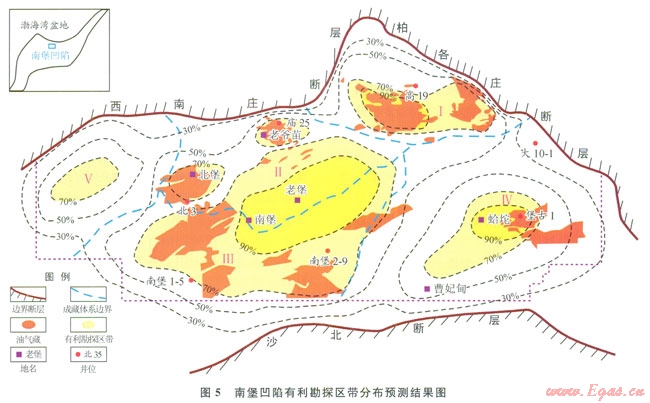 南堡凹陷油氣成藏概率大于70%的地區(qū)在各油氣成藏體系中均有分布,這也表明,該區(qū)各油氣成藏體系均存在有利的勘探區(qū)。其中,南堡Ⅱ號和南堡Ⅲ號油氣成藏體系的分布范圍最廣;其次為南堡Ⅰ號和南堡Ⅳ號油氣成藏體系;南堡V號成藏體系的分布范圍相對較小。南堡Ⅰ號油氣成藏體系中,現(xiàn)今已發(fā)現(xiàn)的油氣藏主要位于該區(qū)有利勘探區(qū)帶的預(yù)測范圍內(nèi);南堡Ⅱ號和南堡Ⅲ號油氣成藏體系中,現(xiàn)今已發(fā)現(xiàn)的油氣藏基本上位于有利勘探區(qū)帶預(yù)測范圍的外圍部位,這些部位基本上屬于構(gòu)造高部位,而被這些構(gòu)造高部位包圍的地區(qū)仍是有利的潛在勘探區(qū)(圖5),該區(qū)主要包挺括了南堡凹陷最大的次凹——林雀次凹。林雀次凹臣厚的泥(頁)巖中發(fā)育火量的濁積砂體,這些砂體自沉積初始期就被烴源巖包圍,容易形成透鏡體油氣藏。在次凹邊緣斜坡的不整合面部位,發(fā)育分選磨圓較好的孔隙性砂巖,隨水體加深,在砂層之上超覆了不滲透的泥巖便形成了地層超覆類圈閉。其次,林雀次凹的深部位還具有形成非常規(guī)氣藏的地質(zhì)條件,如頁巖氣、深盆氣已經(jīng)開始引起重視[36]。南Ⅳ號和南堡V號油氣成藏體系的油氣勘探程度低,發(fā)現(xiàn)的油氣較少。但仍然存在油氣勘探柑利區(qū)(圖5)。因此,南饅凹陷最有利的潛在勘探區(qū)是林雀次凹及其周邊地區(qū),其次為南堡Ⅳ號和南堡V號油氣成藏體系。