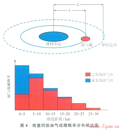 源控油氣作用研究的目的是尋找剩余油氣資源,由此需要建立定量的油氣分布預(yù)測模型。姜福杰提出了油氣分布門限的概念并建立了定量化的數(shù)學(xué)表征模型[14],但主要是基于構(gòu)造油氣藏的分布規(guī)律統(tǒng)計所得,油氣的分布隨排烴距離的增大呈現(xiàn)先增大后減小的趨勢,即排烴中心附近油氣也較少。這忽略了巖性油氣藏和頁巖氣等非常規(guī)油氣藏往往位于烴源巖的牛排烴中心部位,利用該模型深入預(yù)測隱蔽油氣藏和非常規(guī)油氣藏的分布具有局限性,因此需要建立更完善的定量預(yù)測模型。在高成熟探區(qū),如果考慮隱蔽油氣藏和非常規(guī)油氣藏,油氣的分布可能只隨排烴距離的增大而減小,這也已被部分學(xué)者所證實[33-35],即在中央部位聚集的油氣最多,油氣成藏概率越大;中央部位向外圍部位,聚集的油氣逐漸較少,油氣成藏概率變小(圖4)。