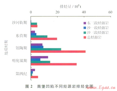 南堡凹陷3套烴源巖熱演化程度有所差異,因此不同烴源巖的主要排烴時期和排烴量也存在差異(圖2)。沙三段烴源巖發(fā)生大規(guī)模排烴的時間較早,在沙河街組沉積期就發(fā)牛一定規(guī)模的排烴過程,東營組沉積期以來發(fā)生了大規(guī)模的排烴過程;沙一段和東三段烴源巖發(fā)生大規(guī)模排烴的時間較晚,其大規(guī)模排烴的時間主要集中在館陶組沉積期以來??偟膩碚f東營期、館陶期和明化鎮(zhèn)期是主要的排烴期,且3套烴源巖均只有1次排烴高峰期,說明南堡凹陷只有1次主要成藏期。且至今仍在成藏過程中,這和前人利用烴類流體包裹體均一化溫度分析結(jié)果一致。南堡凹陷發(fā)生油氣充滓過程的時間跨度大,從東營組沉積時期至第四系沉積時期均有油氣成藏[20]。