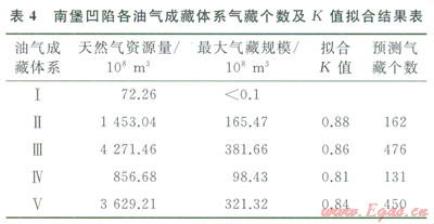 K值的大小關(guān)系到所預(yù)測氣藏的個數(shù)及氣藏的規(guī)模。在K值的獲取過程中,普遍采用的方法是依據(jù)已發(fā)現(xiàn)油氣藏的儲量和規(guī)模數(shù)據(jù)來進行擬合,因此所需要的油氣藏數(shù)據(jù)較多。而南堡凹陷已發(fā)現(xiàn)的油氣藏個數(shù)總體并不太多,尤其氣藏個數(shù)更少,因此,有必要對K值的求取方法進行改進。針對南堡凹陷各油氣成藏體系,本次研究基于渤海灣盆地油氣資源動態(tài)評價的認識,將l5×104t油氣當(dāng)量的油氣藏作為商業(yè)油氣勘探開發(fā)的下限(最小油氣藏規(guī)模),以儲量規(guī)模最大的油(氣)藏為第l序號油氣藏,取任意K值進行擬合,K值的最終確定需要滿足以下2個條件:①使得最大序號油(氣)藏的儲量接近l5×104t;②所有油氣藏的儲量之和接近成藏體系的油氣資源總量。由此擬合得到K值和油氣藏個數(shù),表4為南堡凹陷各成藏體系氣藏個數(shù)與K值擬合結(jié)果,其中南堡Ⅲ號成藏體系氣藏的個數(shù)最多,為476個。