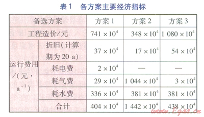 按照各方案的系統(tǒng)設(shè)備組成估算造價,同時結(jié)合各方案的運(yùn)行要求,測算年水、電、氣的消耗費(fèi)用。各方案主要經(jīng)濟(jì)指標(biāo)見表1。