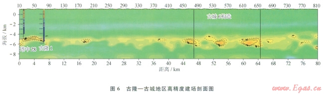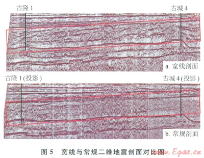 2008年首次在臺盆區(qū)沙漠腹地開展寬線攻關,采集了2條共l47km的寬線,一條是古隆1—古城4井的連井剖面,一條是過古城6號構造的近南北向剖面。寬線攻關目的有兩個:①尋找層間巖溶儲層的地震依據(jù);②降低三維地震部署風險。實施效果表明寬線攻關效果顯著,主要表現(xiàn)為資料品質(zhì)有較大程度改善,古城4與古隆地區(qū)油氣顯示層位大體相當(圖5),大大提高該區(qū)的地質(zhì)認識,為三維地震部署提供了依據(jù)。