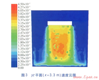 yz平面(x=3.3m)速度云圖見圖3,yz平面(x=3.3m)對稱軸(z軸方向)的流速見圖4。由圖3、4可知,貼附射流的流速沿射程方向呈現(xiàn)先增大后減小的變化趨勢。這種變化是貼附射流在發(fā)展的過程中,受豎向慣性力和豎向浮升力共同作用的結(jié)果。由于送風溫度較低,在出口階段氣流密度較大,氣流豎向慣性力作用比豎向浮升力作用明顯,因此對氣流起著加速作用。隨著貼附射流的發(fā)展,氣流溫度升高,豎向浮升力作用加強以及氣流接近地面時受阻,流速逐漸下降。