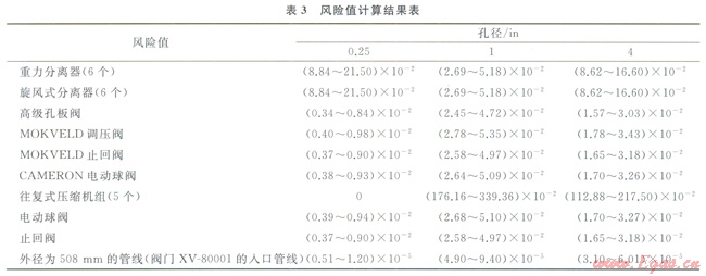 設(shè)備或管線的風(fēng)險(xiǎn)值為失效后果和失效概率的乘積(表3),設(shè)備風(fēng)險(xiǎn)要比管線風(fēng)險(xiǎn)大得多,而其中5套壓縮機(jī)組不論是失效后果還是失效概率都是最大的,其次是重力分離器和旋風(fēng)式分離器,以上所得風(fēng)險(xiǎn)數(shù)值為相對(duì)比較數(shù)值,不同站、同站不同區(qū)域之間沒有可比性。