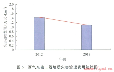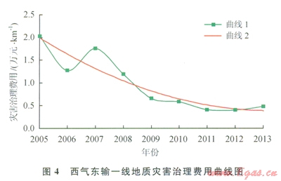 西氣東輸管道地質災害維護費用統(tǒng)計如圖4、5所示,圖4中的曲線l為管道地質災害風險治理維護費用曲線,曲線2為二次擬合曲線。2條曲線的趨勢表明:西氣東輸一線在開展地質災害完整性管理后,管道地質災害風險治理維護費用逐年降低,當前治理費用水平約為2005年的l/4,并趨近于穩(wěn)定水平。圖5數(shù)據(jù)表明西氣東輸二線投產(chǎn)第一年地質災害治理費用與西氣東輸一線2005年相比減少約l/3,且治理費用逐年下降。2013年西氣東輸二線治理費用比西氣東輸一線約高l倍,預計未來幾年堅持管道地質災害完整性管理后,西氣東輸二線地質災害管理將逐步趨于穩(wěn)定水平。