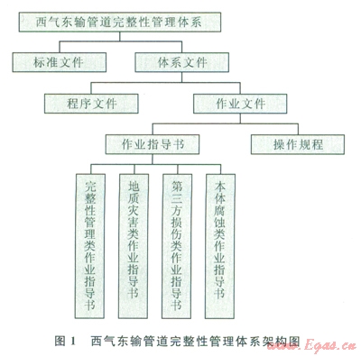 西氣東輸管道完整性管理體系是西氣東輸HSE管理體系的分支,包括標準體系和體系文件兩部分,其中體系文件又包括程序文件和作業(yè)文件兩部分,具體架構如圖l所示。目前,西氣東輸管道公司管道完整性管理體系包含1 2個標準文件,4個程序文件和41個作業(yè)文件[12-14]。