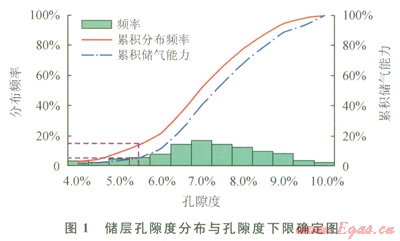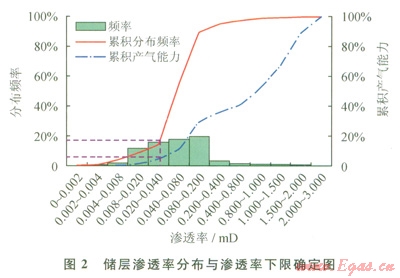 應(yīng)用經(jīng)驗(yàn)統(tǒng)計(jì)法劃分P地區(qū)須二段氣藏物性下限效果(圖l、2)。按照儲氣能力丟失5%為界限,確定孔隙度下限值為5.5%,此時(shí)樣品丟失率為l6.95%;按產(chǎn)氣能力丟失5%為界限,確定滲透率下限值為0.033mD,此時(shí)樣品丟失率為18.24%。以孔隙度5.5%、滲透率0.033mD作為下限值,其儲氣能力和產(chǎn)氣能力丟失都很小,認(rèn)為該下限值是比較合適的。