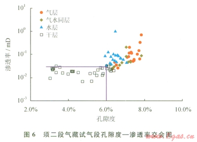 統(tǒng)計(jì)取心井試氣層段資料點(diǎn)的孔隙度和滲透率數(shù)值,結(jié)合試氣結(jié)論,繪制孔隙度—滲透率交會圖(圖6)。在資料齊全且可信度高的情況下,這種方法可以高效直觀地劃分出有效儲層的物性下限。將P地區(qū)須二段氣藏試氣段巖心分析孔隙度與滲透率作交會圖版,并按照試氣結(jié)論標(biāo)在圖版上,可以確定孔隙度下限值為6%,滲透率下限值為0.04mD。