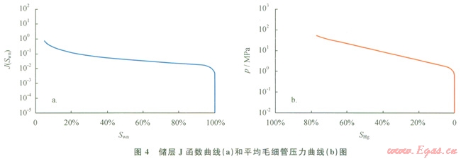 用J函數(shù)法對P地區(qū)須二氣藏4口井36塊巖心的壓汞資料進(jìn)行處理,得到J函數(shù)曲線(圖4-a)和儲層平均毛細(xì)管壓力曲線(圖4-b,圖中SAg為進(jìn)汞飽和度),再利用Purcell法和Wall法計(jì)算儲層的最小流動孔喉半徑。