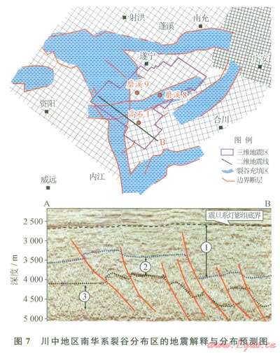 根據(jù)對(duì)川中地區(qū)震旦系燈影組以下層位的地震反射特征解釋,可以進(jìn)一步識(shí)別出裂谷形態(tài)及分布特征。圖7可以看出在南充—遂寧之間、磨溪地區(qū)存在近東西向裂谷,而高石梯以西存在近南北向裂谷。根據(jù)3D地震反射特征,可以將裂谷區(qū)充填地層劃分為3的反射層組(圖7)。①反射層組為較連續(xù)反射,成層性好,厚度變化較大,地震反射時(shí)間介于600~1300ms;②反射層組為斷續(xù)反射,底界反射波組連續(xù)性較強(qiáng),可能是某個(gè)地層界面的反射特征;③反射層組為雜亂反射。從解釋的斷裂來看,既有正斷層也有逆斷層,反映裂谷區(qū)經(jīng)歷了復(fù)雜的構(gòu)造演化歷史。當(dāng)然,區(qū)內(nèi)的地震解釋方案尚沒有得到鉆井證實(shí),有待進(jìn)一步深化研究。