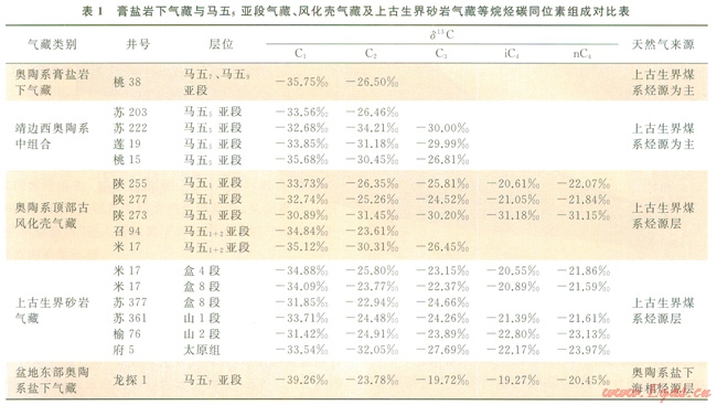 靖邊氣田西北側(cè)已有1口探井(桃38井),奧陶系馬家溝組馬五段地層保存齊全,在鉆穿馬五6亞段膏鹽巖層后,于馬五7、馬五9亞段白云巖中見到較好的含氣顯示(氣層距奧陶系頂面風(fēng)化殼超過200m),后經(jīng)酸化改造、試氣獲得l2.91×104m3/d的較高產(chǎn)工業(yè)氣流,成為盆地內(nèi)首次在膏鹽巖下深層獲得工業(yè)氣流的探井,產(chǎn)層天然氣樣品的甲烷碳同位素值為-35.75‰,乙烷碳同位素值為-26.50‰,與盆地本部來源于上古生界煤系烴源巖的奧陶系頂部風(fēng)化殼氣藏、上古生界砂巖氣藏、奧陶系中組合馬五5亞段氣藏等的天然氣烷烴碳同位素組成基本一致(表1)。這類煤系烴源氣藏的甲烷碳同位素值一般在-30‰~-36‰之間,乙烷碳同位素值為-23‰~-30‰之間[18-22],證實了膏鹽巖下圈閉的有效性及氣源主要來自上古生界煤系烴源巖的基本成藏特征。另外,近期通過靖邊氣田勘探早期鉆入膏鹽巖下深層的探井復(fù)查分析,也發(fā)現(xiàn)l0余口探井在膏鹽巖下有一定的含氣顯示,但由于當(dāng)初勘探重點是奧陶系頂部的馬五1+2亞段風(fēng)化殼氣藏,對馬五5亞段及以下的中下組合含氣層系認(rèn)識不足,加之個別井試氣效果不理想,也就沒有進一步深入勘探之。