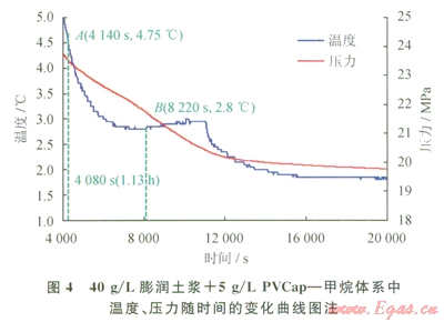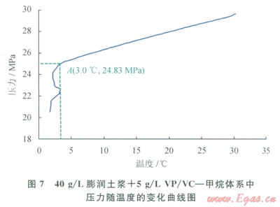 VP/VC屬于第二代天然氣水合物動力學(xué)抑制劑,由N-乙烯基吡咯烷酮和N-乙烯基己內(nèi)酰胺共聚而成。圖7、8反映了加入VP/VC后膨潤土漿中水合物的生成過程。