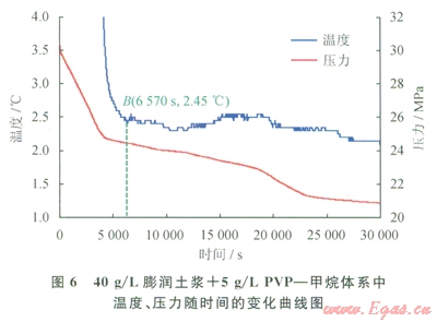 PVP作為第一代天然氣水合物動力學(xué)抑制劑的代表,近年來應(yīng)用較多。圖5、6反映了加入PVP后膨潤土漿中水合物的生成過程。