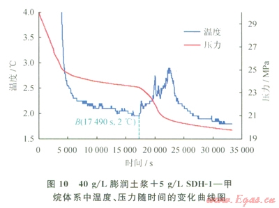 三元聚合物抑制劑SDH-l在VP/VC分子結(jié)構(gòu)基礎(chǔ)上引入了強親水性基團,以增加聚合物的水溶性。圖9、10反映了加入SDH-1后膨潤土漿中水合物的生成過程。