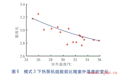 模式3下熱泵機(jī)組制冷性能系數(shù)隨室外溫度的變化見(jiàn)圖5,圖中紅色點(diǎn)為實(shí)測(cè)數(shù)據(jù)點(diǎn),平滑曲線為擬合曲線:ICOP=0.0011q2-0.1002q+5.2887。由圖5可知,模式3下熱泵機(jī)組制冷性能系數(shù)下降速率比模式1有所減緩,這說(shuō)明風(fēng)冷—水冷冷凝器聯(lián)合運(yùn)行時(shí),熱泵機(jī)組性能受室外溫度的影響有所減弱。模式3下熱泵機(jī)組能效比隨室外溫度的變化見(jiàn)圖6,圖中紅色點(diǎn)為實(shí)測(cè)數(shù)據(jù)點(diǎn),平滑曲線為擬合曲線:IEER=0.0011q2-0.0965q+4.9327。由圖5、6可知,模式3下熱泵機(jī)組能效比的變化趨勢(shì)與制冷性能系數(shù)基本一致。
