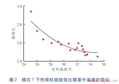 模式1下熱泵機(jī)組制冷性能系數(shù)隨室外溫度的變化見(jiàn)圖l,圖中紅色點(diǎn)為實(shí)測(cè)數(shù)據(jù)點(diǎn),平滑曲線為擬合曲線:ICOP=0.0046q2-0.3224q2+8.2426,q為室外溫度(單位為℃)。由圖1可知,模式1下熱泵機(jī)組制冷性能系數(shù)隨室外溫度的升高而降低,且下降速率較快。這說(shuō)明空氣源熱泵的性能易受室外溫度影響,當(dāng)室外溫度升高時(shí),冷凝器的工作環(huán)境惡化,制冷劑甚至不能及時(shí)液化,直接導(dǎo)致熱泵機(jī)組的制冷性能系數(shù)下降。模式l下熱泵機(jī)組能效比隨室外溫度的變化見(jiàn)圖2,圖中紅色點(diǎn)為實(shí)測(cè)數(shù)據(jù)點(diǎn),平滑曲線為擬合曲線:IEER=0.0038q2-0.2606q+7.0016。由圖1、2可知,模式1下熱泵機(jī)組能效比隨室外溫度的升高而降低,變化趨勢(shì)與制冷性能系數(shù)基本一致。