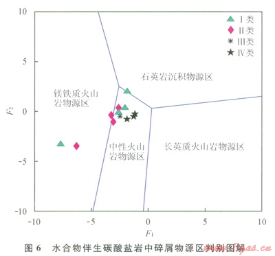 Roser和Korsch[28]曾提出通過沉積巖中Ti、Fe、Mg、Na、K氧化物含量對(duì)Al2O3含量比值作為判別函數(shù),來區(qū)分沉積巖碎屑物源區(qū)是鐵鎂質(zhì)、中性、長英質(zhì)火山巖和石英巖4種沉積物源區(qū)(圖6)。判別函數(shù)F1=30.638TiO2/Al2O3-12.54Fe2O3/Al2O3+7.329MgO/Al2O3+12.031Na2O/Al2O3+35.402K2O/A12O3-6.382;判別函數(shù)F2=36.500TiO2/Al2O3-10.879Fe2O3/Al2O2+30.875MgO/Al2O3-5.404Na2O/Al2O3+11.112K2O/Al2O3-3.89[29-30]。從圖6中看出,祁連山凍土區(qū)4類碳酸鹽巖中碎屑大部分為中性火山巖物源區(qū)。其中,第Ⅱ類碳酸鹽巖中的碎屑部分顯示中性火山巖物源區(qū)與鎂鐵質(zhì)火山巖物源區(qū)交界處,更偏于鎂鐵質(zhì)火山巖物源區(qū)。這與前述分析相一致,即該類碳酸鹽巖中黏土類礦物在沉積中貢獻(xiàn)較小,該類碳酸鹽巖中åREE平均含量最低(103.61mg/g),顯示為Eu正異常。