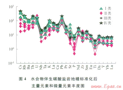 巖石化學(xué)蝕變指數(shù)(CIA)——CIA指數(shù)=[Al2O3/(A12O3+CaO+Na2O+K2O)]×100,表達(dá)了Al2O3(含鋁黏土礦物)、(CaO+Na2O)(斜長石)和K2O(鉀長石)含量之間的變化關(guān)系,反映出沉積烴源巖特征[27]。該區(qū)4類碳酸鹽巖樣品中CIA指數(shù)分別約為32、36、44、72,第Ⅰ類和第Ⅱ類碳酸鹽巖中混入的碎屑部分程度最弱,因?yàn)檫@個(gè)原因,第Ⅱ類碳酸鹽巖樣品中稀土元素含量最低(其平均約為l03.61mg/g,而第Ⅰ、Ⅲ、Ⅳ類碳酸鹽巖樣品中稀土元素含量分別約為137.48mg/g、197.83mg/g、230.07mg/g),其樣品中主量元素和微量元素含量也相對(duì)最低(表3、4),即表明黏土礦物對(duì)該類碳酸鹽巖形成過程中的貢獻(xiàn)最小。