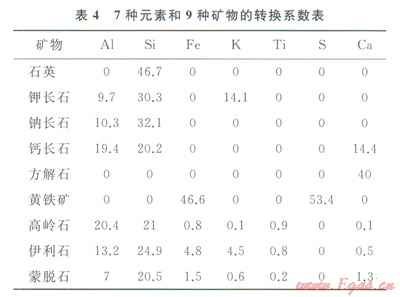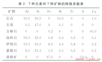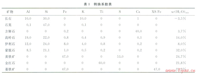 表l是Herron等人給出的一個(gè)9種礦物的轉(zhuǎn)換系數(shù),其中的XS Fe表示剩余鐵,w(H2O)min表示礦物中的水含量。