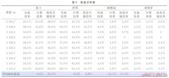 表5是對(duì)幾種主要礦物含量計(jì)算結(jié)果的誤差分析。從表5中可以看出,對(duì)于含量大于20%的黏土和砂質(zhì),筆者計(jì)算的礦物含量的平均相對(duì)誤差分別為9.6%和9.4%,均小于10%。雖然碳酸鹽和黃鐵礦的平均相對(duì)誤差較大,但由于這兩種礦物含量較少,這樣的結(jié)果也是可以接受的。與斯倫貝謝Spectrolith模型計(jì)算的結(jié)果相比,筆者計(jì)算的4種礦物的平均相對(duì)誤差均小于斯倫貝謝計(jì)算結(jié)果。