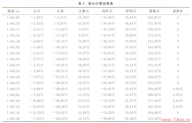 從表3中可以看出該結(jié)果中多種礦物含量為負(fù)值,且有的礦物含量為大于l00%的值,這樣的結(jié)果顯然是不合理的。經(jīng)分析檢驗(yàn),修正后的轉(zhuǎn)換系數(shù)矩陣條件數(shù)較大,為病態(tài)方程組,所以用一般的數(shù)值解法會(huì)有較大的誤差,甚至嚴(yán)重失真。所以需要根據(jù)本地區(qū)巖心的資料對(duì)轉(zhuǎn)換系數(shù)做更進(jìn)一步的校正。