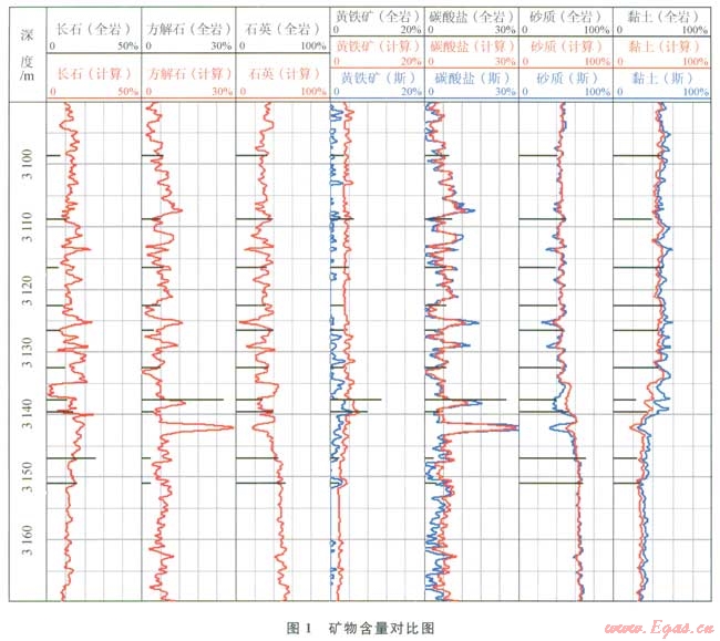 碳組分碳酸鹽則由鈣組分的測(cè)量中精準(zhǔn)地獲得,石膏鹽則由Ca和S的測(cè)量來確定,地層中的剩余組分則為QFM(石英+長(zhǎng)石+云母)[7-8]。從圖1中可以看出,筆者計(jì)算得到的砂質(zhì)與斯倫貝謝計(jì)算的砂質(zhì)吻合的非常好,變化趨勢(shì)基本一致;黏土和碳酸鹽吻合較好,整體變化趨勢(shì)一致;而黃鐵礦吻合效果較差,但筆者計(jì)算的結(jié)果與全巖分析的吻合效果優(yōu)于斯倫貝謝與全巖分析的吻合結(jié)果。