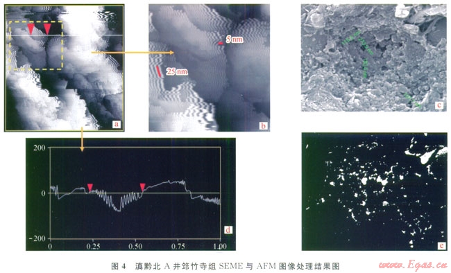 通過將A井筇竹寺組具有代表性的頁巖巖心拋光樣品進(jìn)行AFM和SEME圖像處理與分析,將圖像數(shù)據(jù)導(dǎo)入ArcGIS平臺中進(jìn)行柵格重分類分析,圖像中白色區(qū)域?yàn)榭紫痘蛄严斗植紖^(qū)(圖4-d、4-c)。由此計算出不同樣品中微觀孔隙的孔隙數(shù)量及其面孔率(表1)。與龍馬溪組頁巖相比,筇竹寺組頁巖具有微觀孔隙數(shù)量多、孔徑小、單孔面積小、而孔率大的特征。由AFM剖面圖清晰地顯示出,規(guī)則排列的柵格間為納米級孔隙,具有鋸齒狀緊密排列的結(jié)構(gòu)特征(圖4-a、4-c),這種規(guī)則的呈明暗相間的柵格狀表面形態(tài)特征可能是頁巖中干酪根大分子團(tuán)緊密排列的結(jié)果[27-28]。