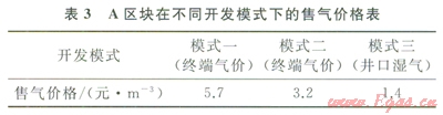 經(jīng)濟評價模型中計算了3種開發(fā)模式:①水下井口+綜合處理平臺+水下管道+陸上終端;②水下井口+綜合處理平臺+租用其他公司管道;③水下井口+FLNG裝置。在模式③中,由于FLNG的成本回收期設(shè)計為25年,對于此類0.5TCF及其以下規(guī)模氣田,在A區(qū)塊生產(chǎn)8年后需尋找其他類似規(guī)模氣田接替生產(chǎn)l7年,若接替氣田儲量更加優(yōu)質(zhì),將縮短接替年限或獲得更高的收益。在A區(qū)塊的8年經(jīng)濟年限中,若實現(xiàn)10%的內(nèi)部收益,采用不同開發(fā)模式所獲得的上游售氣價格見表3。