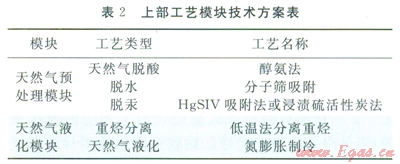 FLNG上部工藝模塊主要由天然氣進氣模塊、天然氣預(yù)處理模塊、天然氣分餾模塊、天然氣液化模塊、BOG處理模塊、產(chǎn)品儲存和卸料系統(tǒng)、公共工程模塊、火炬和壓力釋放系統(tǒng)等組成。針對海上作業(yè)的特殊環(huán)境條件,工藝方案設(shè)計時考慮了海上適用性、復(fù)雜程度、緊湊性、能耗、可靠性及安全性等關(guān)鍵因素,參考國外FLNG工藝流程的推薦方案,初步確定工藝方案如表2所示。其中,天然氣的液化工藝直接影響整個裝置運行的合理性和適用性,液化設(shè)備投資占FLNG上部模塊總投資的30%左右。目前,世界上l~2MTPA規(guī)模的FLNG以氮膨脹工藝為主,氮膨脹工藝技術(shù)成熟,工藝結(jié)構(gòu)簡單,海上適應(yīng)性強,冷劑種類少,安全性高,唯一不足是在能耗上高于混合制冷劑工藝。但針對0.5MTPA及其以下規(guī)模的小型液化裝置,功耗影響較弱。因此氮膨脹制冷工藝是首選。此外,在裝置模塊的布置方面,應(yīng)考慮安全、環(huán)保和人員健康等要求,同時綜合考慮工藝流程設(shè)計的合理性和操作維修的方便性,所有模塊設(shè)計應(yīng)易于建造[6-7]。