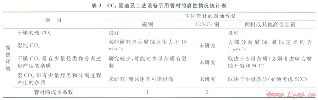 CO2管道及工藝設(shè)備所用管材的腐蝕情況統(tǒng)計(jì)結(jié)果見(jiàn)表3[6]。