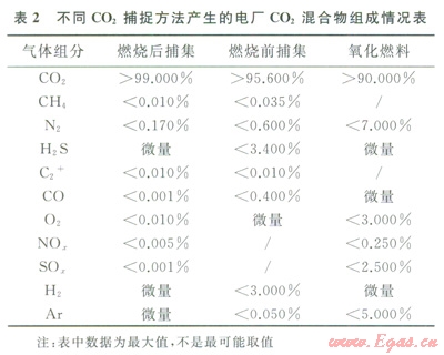 電力行業(yè)是主要的CO2排放源。電廠(chǎng)CO2捕捉的3個(gè)主要方法是:①燃燒前捕集;②燃燒后捕集;③氧化燃料。使用不同CO2捕捉方法所產(chǎn)生的CO2混合氣體雜質(zhì)含量也不同。采用不同CO2捕捉方法得到的典型CO2混合氣體組成情況見(jiàn)表2[2]。CO2混合氣體的組分含量取決于多個(gè)因素,如果對(duì)其他化合物不進(jìn)行純化和聯(lián)合捕捉就會(huì)達(dá)到表2中的最大濃度。通常最終CO2混合氣體中的H2S和SO2含量遠(yuǎn)低于表2所示的最大濃度。