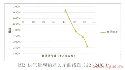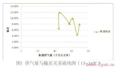 (3)在現(xiàn)有數(shù)據(jù)基礎(chǔ)上,暫未發(fā)現(xiàn)供氣量與輸差之間的明顯函數(shù)關(guān)系。但是,從圖8觀察發(fā)現(xiàn),輸差曲線1、2、3(修正)對(duì)應(yīng)的供氣量依次為:41—45、56—60、61—66,單位千萬(wàn)立方米。隨著供氣量的大幅上升,輸差曲線呈向左下方平移的趨勢(shì)。即溫度等其他條件一定的情況下,隨著供氣量的大幅增加,輸差有減小的趨勢(shì)。初步分析,可能是由規(guī)模效應(yīng)導(dǎo)致。此推斷是否成立有待進(jìn)一步的研究,可做為下一研究課題。