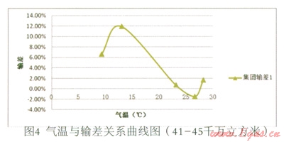 將數(shù)據(jù)按供氣量相近的原則分組(共分為3組:41—45、56—60、61—66,單位千萬(wàn)立方米),每一組按氣溫升序排列。每組內(nèi)部近似忽略供氣量的影響,得到供氣量一定時(shí),氣溫與輸差的關(guān)系曲線如圖4—圖6所示。