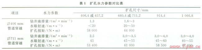 Æ406mm管道穿越擴(kuò)孔施工時(shí)發(fā)現(xiàn)鉆井液排量低于2m2/min、水眼射速低于50m/s時(shí)擴(kuò)孔扭矩大,鉆具磨損快。Æ711mm管道穿越擴(kuò)孔施工時(shí)調(diào)整了施工參數(shù),改進(jìn)了擴(kuò)孔器選型,使得擴(kuò)孔扭矩得到了有效控制,鉆屑及時(shí)排除,水力切削充分,鉆具幾乎沒(méi)有磨損,加快了施工進(jìn)度,保證了每次擴(kuò)孔一次性成功。根據(jù)3次管道穿越對(duì)鉆進(jìn)參數(shù)的調(diào)整情況,并結(jié)合現(xiàn)場(chǎng)實(shí)際可以達(dá)到的施工條件,最優(yōu)的鉆進(jìn)參數(shù)統(tǒng)計(jì)結(jié)果見(jiàn)表2。