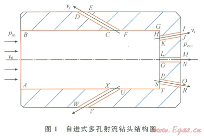 在徑向水平井正常鉆進(jìn)過程中,向后噴射的高速射流從反向孔眼噴出,射流會(huì)從它周圍卷吸流體,由于射流鉆頭前面和四周均為巖石,外界流體補(bǔ)充困難,以至在射流鉆頭后部——環(huán)形區(qū)域形成低壓。由于反向射流是多股均勻分布的,所以在一定條件下可在射流鉆頭后端產(chǎn)生一個(gè)密閉環(huán)境的環(huán)形低壓區(qū)。此區(qū)域壓力低于井底環(huán)境壓力,由于壓差作用,會(huì)對(duì)射流鉆頭和高壓軟管產(chǎn)生一個(gè)向前的力,即為反向射流降壓效應(yīng)的自進(jìn)力產(chǎn)生機(jī)理。