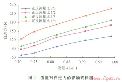 因?yàn)閷?shí)驗(yàn)用多孔射流鉆頭的反向射流流量均大于正向射流流量,由理論分析可知,射流鉆頭會(huì)產(chǎn)生向前的自進(jìn)力,并且隨著流量的增大自進(jìn)力也隨之增大。自進(jìn)力測(cè)試實(shí)驗(yàn)也驗(yàn)證了這一點(diǎn),如圖4所示。選取正反流量比為2/3、1/2、1/3和1/6的射流鉆頭進(jìn)行實(shí)驗(yàn),當(dāng)正向噴距為10mm,井簡(jiǎn)直徑為49mm時(shí),自進(jìn)力隨著流量的增大也隨之增大,近似呈線性關(guān)系變化。以正反流量比為2/3的射流鉆頭為例,流量為0.71L/s時(shí),產(chǎn)生的自進(jìn)力為67.8N;流量為0.75L/s時(shí),產(chǎn)生的自進(jìn)力為74.8N;流量為0.82L/s時(shí),產(chǎn)生的自進(jìn)力為96.9N;流量為0.9lL/s時(shí),產(chǎn)生的自進(jìn)力為118.7N;流量為0.99L/s時(shí),產(chǎn)生的自進(jìn)力為133.2N。這是因?yàn)殡S著流量的增大,射流的總動(dòng)量也隨之增大,反向射流產(chǎn)生的反推力更大,反向射流產(chǎn)生的降壓效果也更加明顯。故可以產(chǎn)生更大的自進(jìn)力。在實(shí)驗(yàn)條件下,流量從0.71L/s增加到0.99L/s,4種不同正反流量比的射流鉆頭所產(chǎn)生的自進(jìn)力范圍為67.8~228.1N。