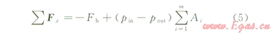 式(2)右邊代表作用于控制體邊界上x軸方向上的外力矢量和,在x軸方向,射流鉆頭受到內(nèi)、外流體對(duì)控制體邊界的壓力,高壓軟管阻礙其前進(jìn)的力,即高壓軟管對(duì)射流鉆頭的拉力,此力大小和射流鉆頭產(chǎn)生的自進(jìn)力相等,方向相反,為作用力與反作用力的關(guān)系,則式(2)右邊可表示為:
