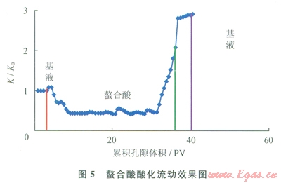 實(shí)驗(yàn)結(jié)果表明:經(jīng)過螯合酸酸化后巖心滲透率顯著提高,滲透率提高將近3倍,而經(jīng)過土酸酸化后巖心滲透率降低,降低幅度達(dá)50%,且使用土酸進(jìn)行酸化流動(dòng)過程中出現(xiàn)巖心脫砂現(xiàn)象,而螯合酸沒有出現(xiàn)脫砂問題,電鏡掃描結(jié)果也顯示土酸酸化后巖心的骨架結(jié)構(gòu)破壞,表面膠結(jié)強(qiáng)度降低,黏土礦物結(jié)構(gòu)遭到破壞,所以出現(xiàn)砂現(xiàn)象。通過掃描螯合酸酸化流動(dòng)前后巖心端面發(fā)現(xiàn),巖石骨架結(jié)構(gòu)未被破壞,且出現(xiàn)明顯的溶蝕孔道,從掃描電鏡看出酸化流動(dòng)后巖石的膠結(jié)情況完好,未出現(xiàn)結(jié)構(gòu)破壞現(xiàn)象。