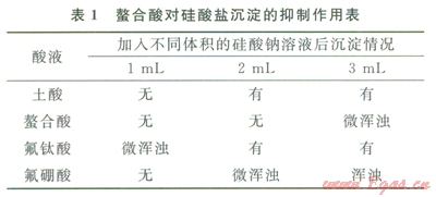 從表l可以看出,氟鈦酸在第一次加入硅酸鈉溶液就產(chǎn)生微渾濁,土酸與氟鈦酸在第二次加入硅酸鈉就產(chǎn)生沉淀,氟硼酸出現(xiàn)少量渾濁,螯合酸在第三次加入硅酸鈉才出現(xiàn)微渾濁,說明螯合酸對(duì)硅酸鹽沉淀的抑制性能好。