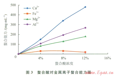 螯合酸對(duì)鈣離子螯合能力最強(qiáng),對(duì)鐵離子螯合能力較弱,隨著螯合酸濃度的升高,對(duì)鈣、鎂、鋁螯合能力逐漸增強(qiáng),當(dāng)螯合酸濃度為l2%時(shí),鈣離子螯合能力最高達(dá)到480mg/mL,鎂離子螯合能力180mg/mL,鋁離子螯合能力268mg/mL,對(duì)鐵離子螯合能力隨著螯合劑濃度增加而降低,濃度8%時(shí)鐵離子穩(wěn)定能力為30mg/mL,濃度l2%時(shí)為17mg/mL,綜合螯合酸對(duì)幾種金屬離子的蝥合能力,當(dāng)螯合劑濃度為l0%,可以實(shí)現(xiàn)對(duì)4種金屬離子高效螯合(圖3)。