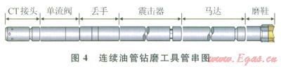 連續(xù)油管鉆磨橋塞工具管串為:卡瓦接頭+馬達頭總成+震擊器+馬達+磨鞋。其中馬達和磨鞋是其中的關(guān)鍵部分,直接影響了工具的使用壽命和鉆磨橋塞的效率(圖4)。
