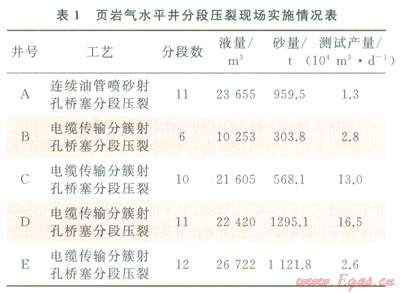 自主技術(shù)先后在四川油氣田長寧威遠國家級頁巖氣示范區(qū)進行了5口水平井的分段壓裂改造實踐。從應(yīng)用情況看,所有技術(shù)或工具能夠滿足頁巖氣水平井分段壓裂的需求,應(yīng)用效果良好(表1)。