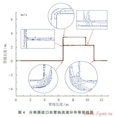 介質在管道輸運過程中,由于其內部流道的變化,局部的流速會遠遠高于整體流速,加之紊流作用影響,因此必定會加劇影響腐蝕速率。圖1所示管線的內流場模擬結果見圖4、5所示。