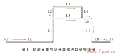 工況以大慶油田徐深6集氣站為例(圖1),管道材質為20G,管徑為89mm,運行壓力15.1MPa,溫度55℃,氣相中含水率為0.001336%。管線各段長度見表l。
