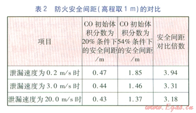 FLUENT軟件雖具有很高的權(quán)威性,但該空間模型還較簡(jiǎn)單。危害氣體源僅考慮CO,忽略其他氣體(如H2)的影響。可通過(guò)理論擴(kuò)散計(jì)算對(duì)微量泄漏工況進(jìn)行驗(yàn)證(無(wú)初速度和重力影響)。理論擴(kuò)散計(jì)算得知,對(duì)微量泄漏,2m高程處,C0體積分?jǐn)?shù)達(dá)到0.02%時(shí)7C0初始體積分?jǐn)?shù)為54%的安全間距是初始體積分?jǐn)?shù)為20%的安全間距的1.64倍,該值與其2m高程時(shí)的模擬安全間距對(duì)比倍數(shù)l.65極為接近,故可充分表明軟件模擬的置信性。